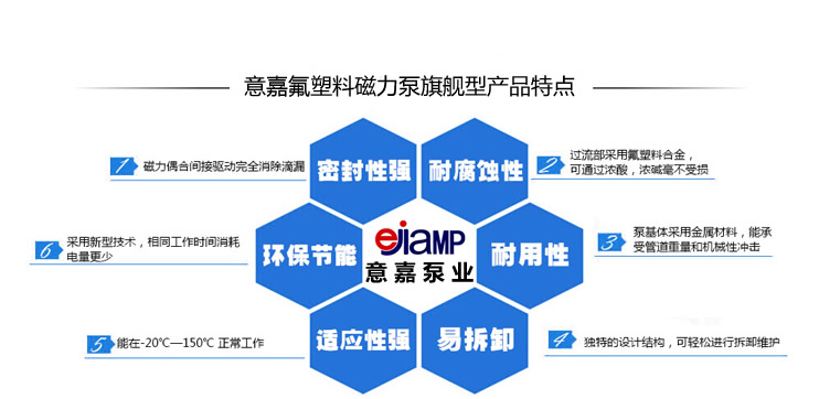 EJIAMP/意嘉CQB-F 氟塑料磁力驅(qū)動泵的過流部件均采用“聚偏二氟塑料合金(PVF2)和超高分子量聚乙烯(UHMWPE)”制造。在常溫下,PVF2對鹵素、鹵代烴、強氟化劑、沸酸、堿等多種有機溶劑都有良好耐蝕性;UHMWPE對非氟化性酸(稀硫酸、硝酸及濃度較大的鹽酸、磷酸、氫氟酸、甲酸、乙酸)、氨和胺及各種堿、鹽溶液都有良好的耐蝕性,兩種材料都不耐強氟化性酸的腐蝕。氟合金泵的外殼為金屬材料,有足夠的強度承受管道以及外界的機械沖擊。傳動功率3KW以下的采用全氟結(jié)構(gòu)。防漏設(shè)計取消了軸封,利用磁力偶合間接驅(qū)動,完全消除了滴漏的煩惱,絕不污染使用場地。由于磁力泵的過流部分選用“氟塑料合金”制造??蛇B續(xù)輸送任意濃度的酸、堿、強氧化劑等腐蝕介質(zhì)而毫不受損。