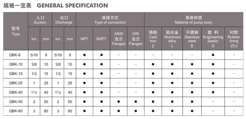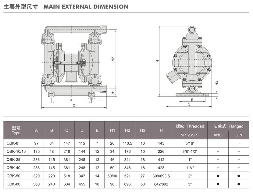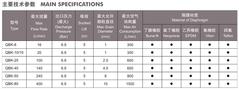 QBK第三代氣動隔膜泵主要技術參數(shù):