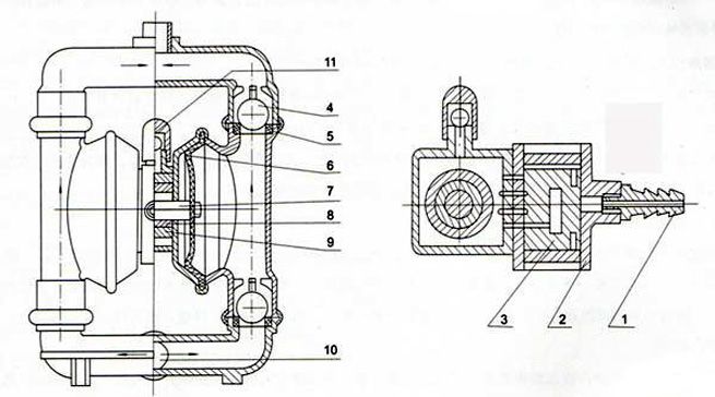 1 | 進(jìn)氣口 | 4 | 圓球 | 7 | 聯(lián)桿 | 10 | 泵進(jìn)口 |