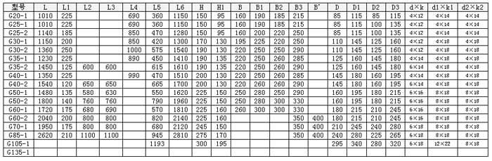| G135-1 | 380 | 132 | 37-4級/齒輪箱 | 380 | 120 | 45-4級/齒輪箱 | 18~180 | 3~56 | 45 |